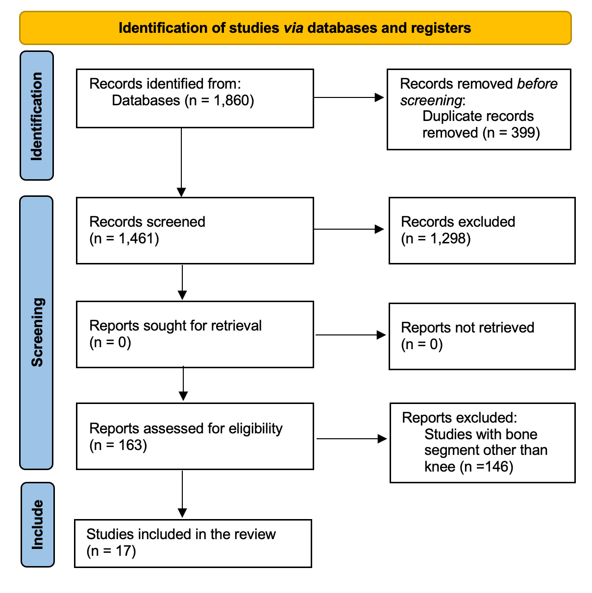 Out of 1,759 studies, 17 studies5-21 (680 knees), published from 2015 to 2025, were selected (Figure 1).