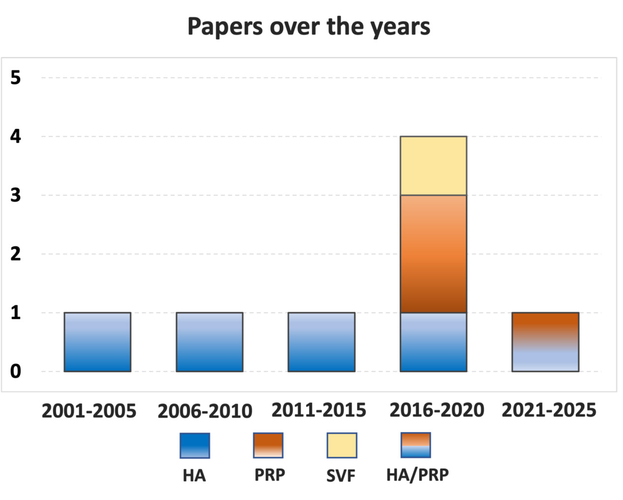 Figure 2. Number of articles published over time on injectable therapies for knee osteoarthritis in elderly patients. HA, Hyaluronic Acid, PRP, platelet-rich plasma, SVF, stromal vascular fraction.
