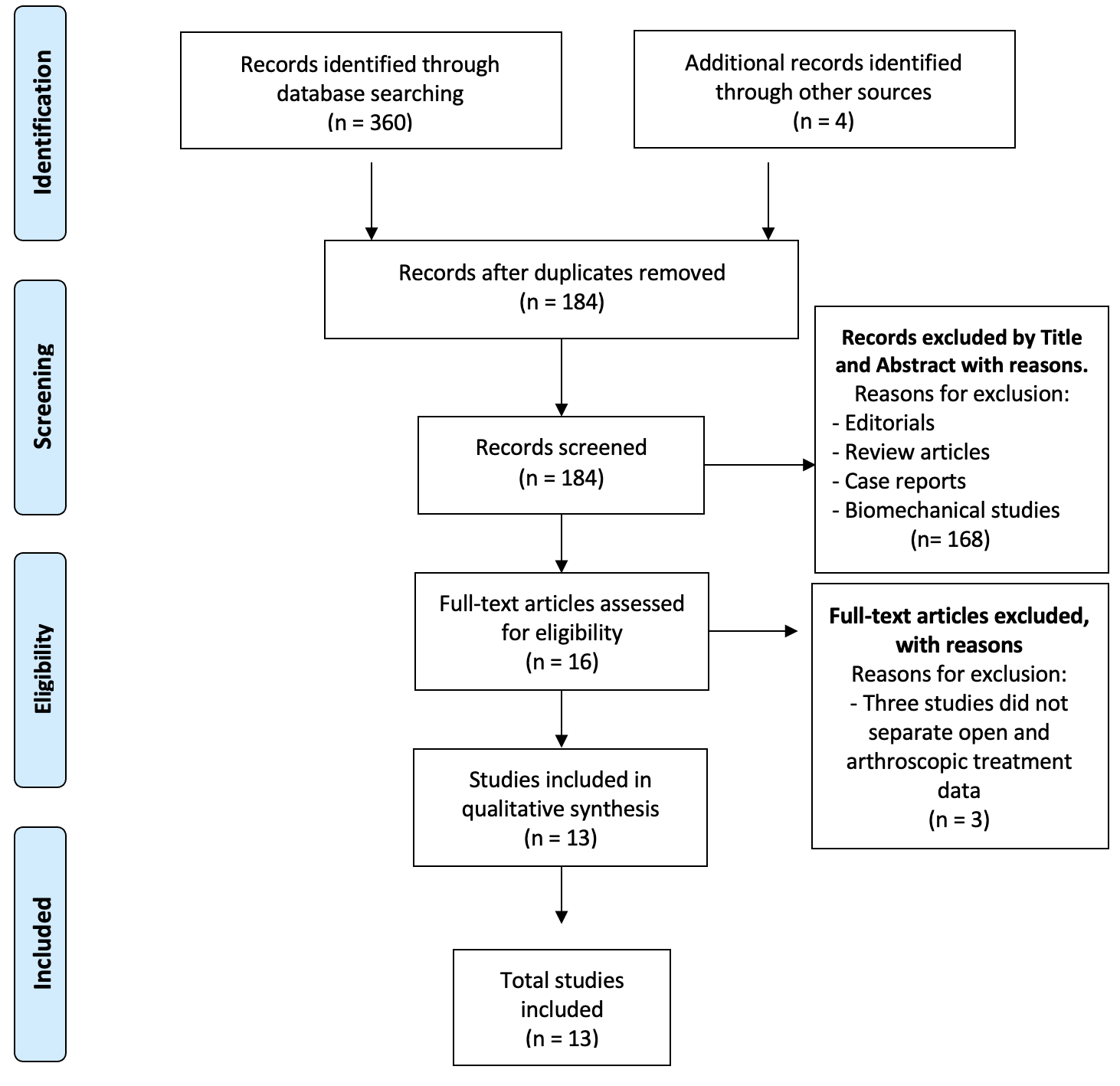 A comprehensive search was conducted in five databases (PubMed, Scopus, Embase, Cochrane, and MEDLINE) using the following MeSH terms: ((synovial chondromatosis) OR (chondromatosis)) AND (arthroscopic*) AND (hip). A total of 364 articles were identified. After removing duplicates, 184 articles remained. Titles and abstracts were screened, resulting in the exclusion of 168 studies. Sixteen articles underwent full-text review, of which 13 met the inclusion criteria and were selected for qualitative analysis. The selected studies provided data on patient positioning, arthroscopic portals, postoperative protocols, functional outcomes, time to symptom resolution, complications, and revision rates in patients treated with ATs for hip SC. The selection process is illustrated in the PRISMA flowchart (Figure 1).