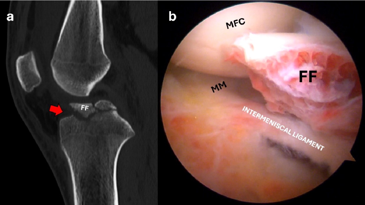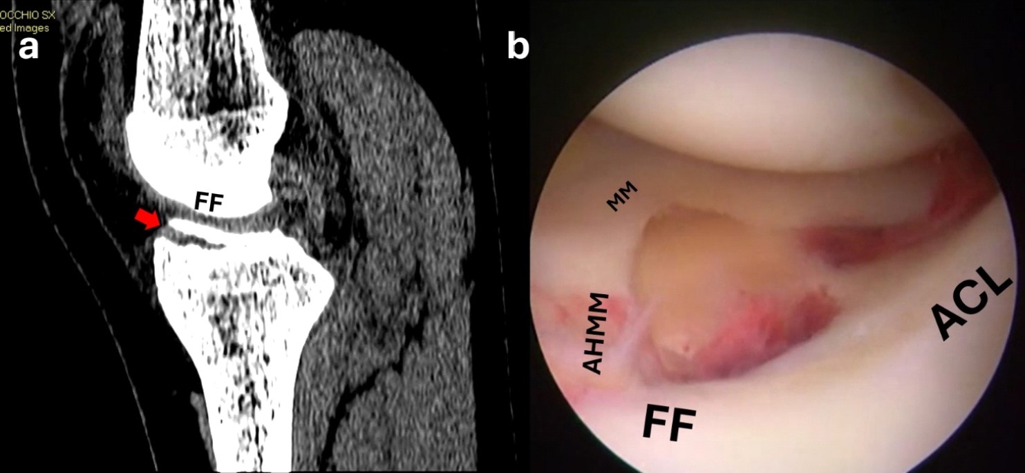Figure 1. Sagittal CT scan showing a displaced anterior eminence fracture (red arrow) (a); the arthroscopic view shows the interposition of the intermeniscal ligament and the fracture bed (b). FF, fracture fragment; MM, medial meniscus; MFC, medial femoral condyle.