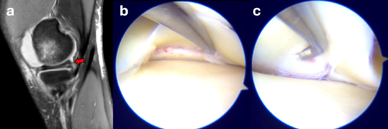 Figure 2. Sagittal MRI images showing a lesion of the medial meniscus posterior horn (red arrow) in combination with anterior tibial eminence fracture (a); arthroscopic view before (b) and after (c) all-inside meniscal repair.