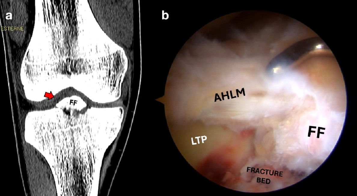 Figure 3. Coronal CT scan showing an anterior eminence fracture (red arrow) displaced laterally and proximally (a); the arthroscopic view shows connection of the anterior horn of the lateral meniscus with the main fracture fragment (b).