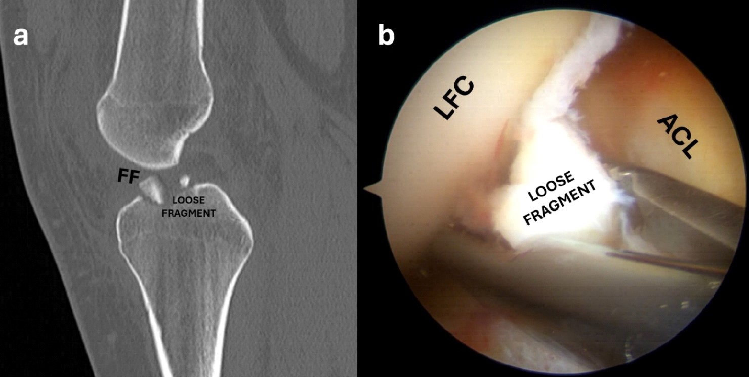 Figure 4. Sagittal CT scan showing a displaced and multifragmentary anterior eminence fracture with a loose fragment (a); the arthroscopic view shows a small loose fragment which is removed with a grasper (b).