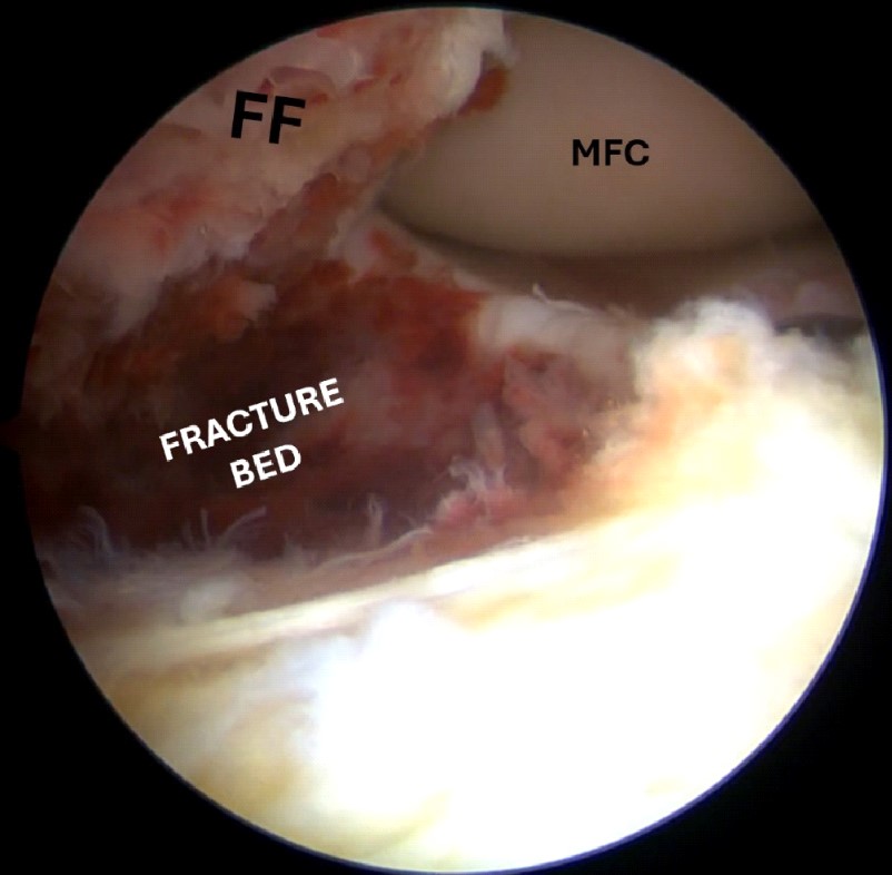 Figure 5. Arthroscopic view after the cleaning of the fracture bed from hematoma and fibrous tissue; the fracture margins can be clearly seen.