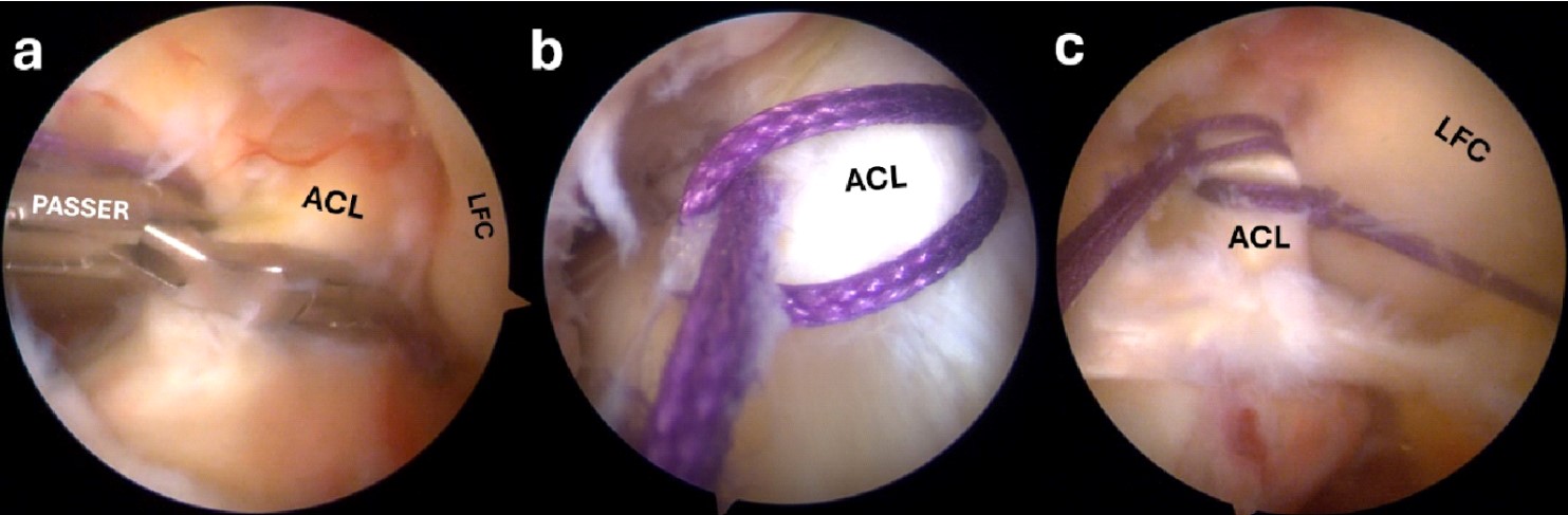 Figure 8. With the suture passer, an absorbable suture is passed through the ACL fibers (a). A loop around the ACL is created with the suture (b). Two loops are placed in the ACL from the two arthroscopic portals (c).