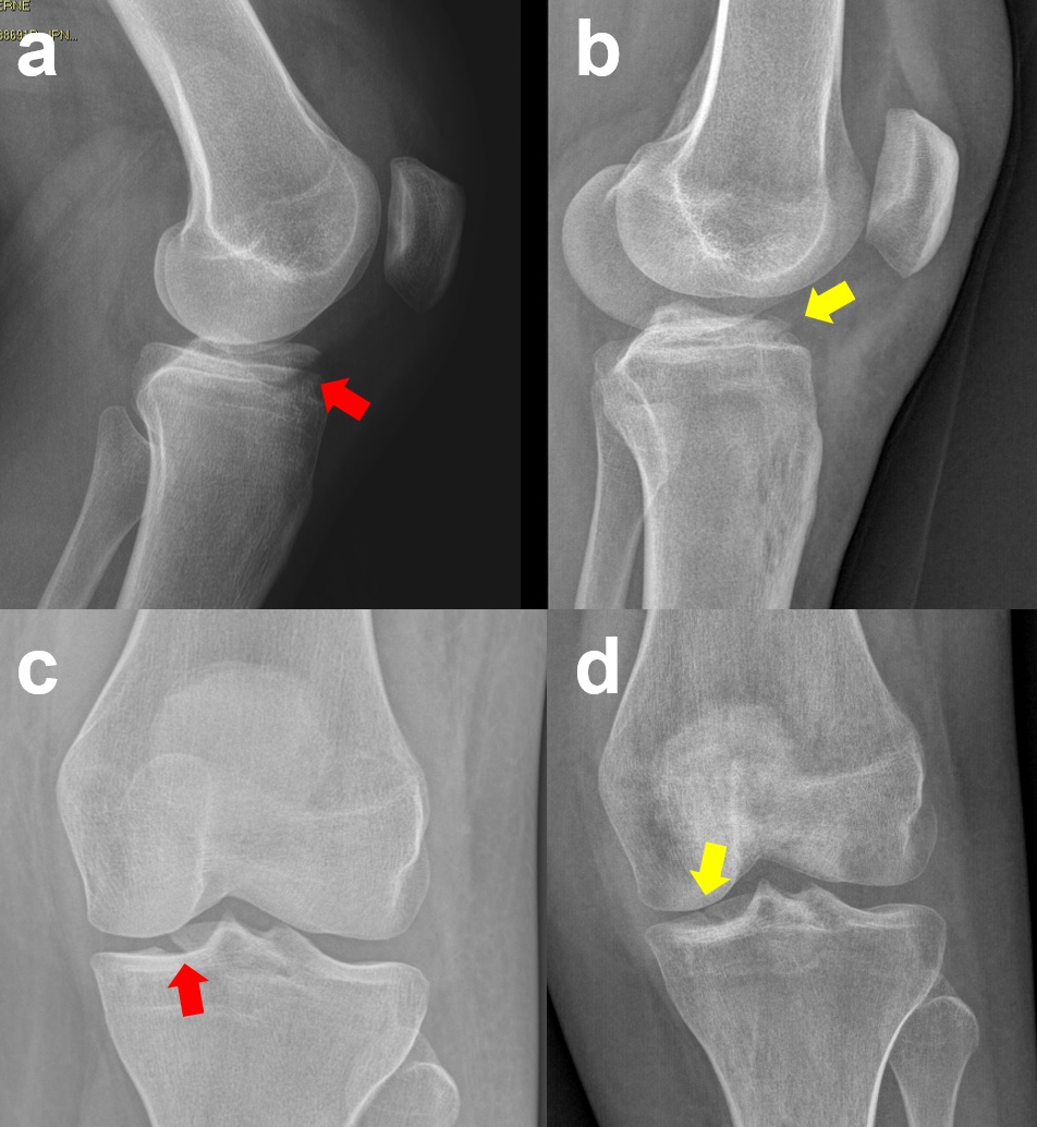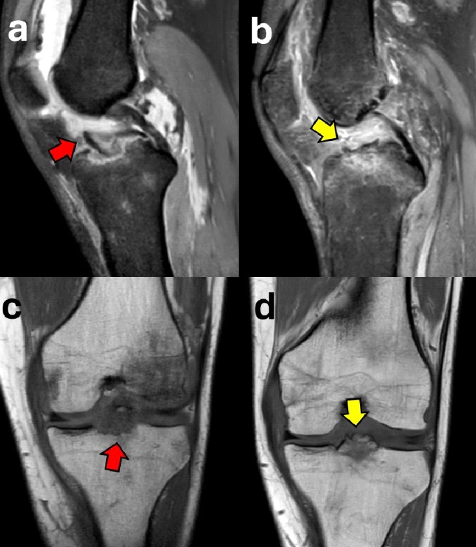 Figure 14. A 24-year-old female with a Meyers and McKeevers Type III fracture (red arrow) in a sagittal MRI scan (a) and the healed and reduced fragment (yellow arrow) 8 weeks after surgery (b); coronal pre-operative (c) and post-operative (d) views of the same patient.