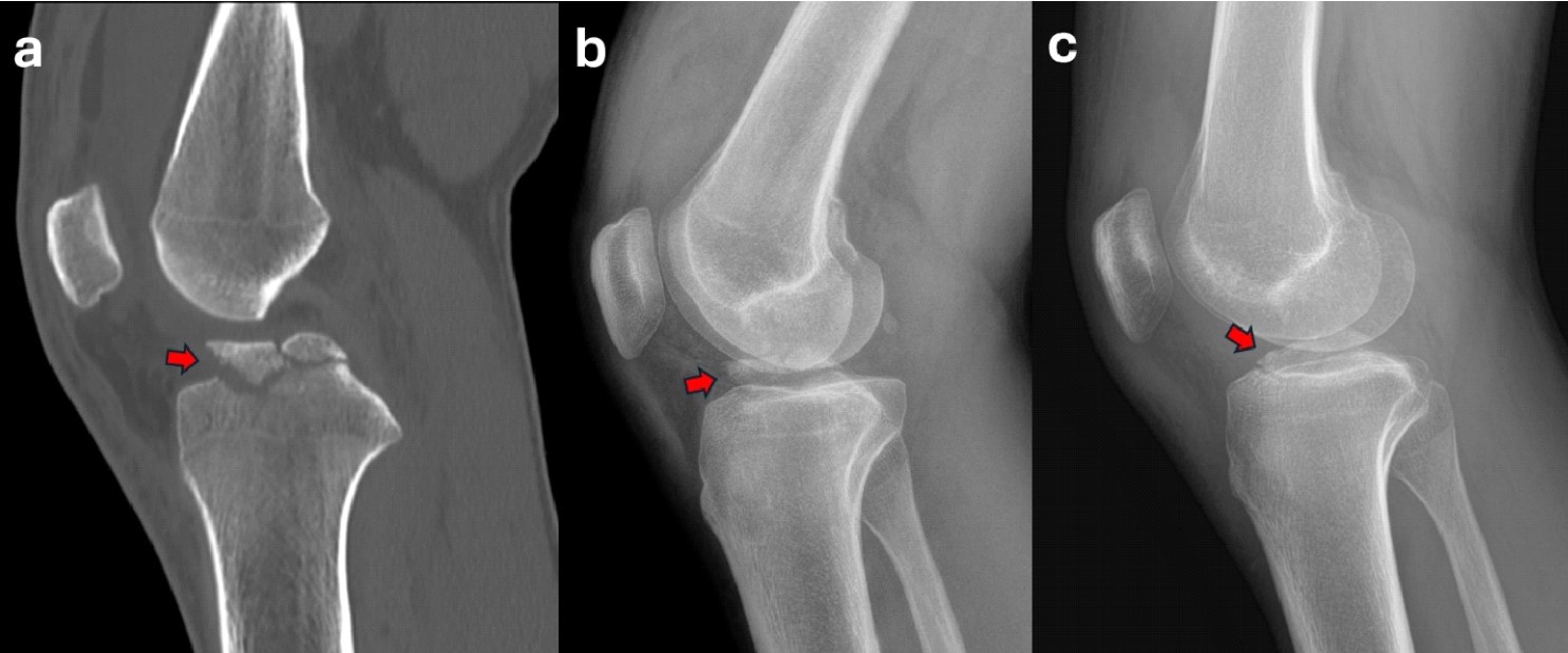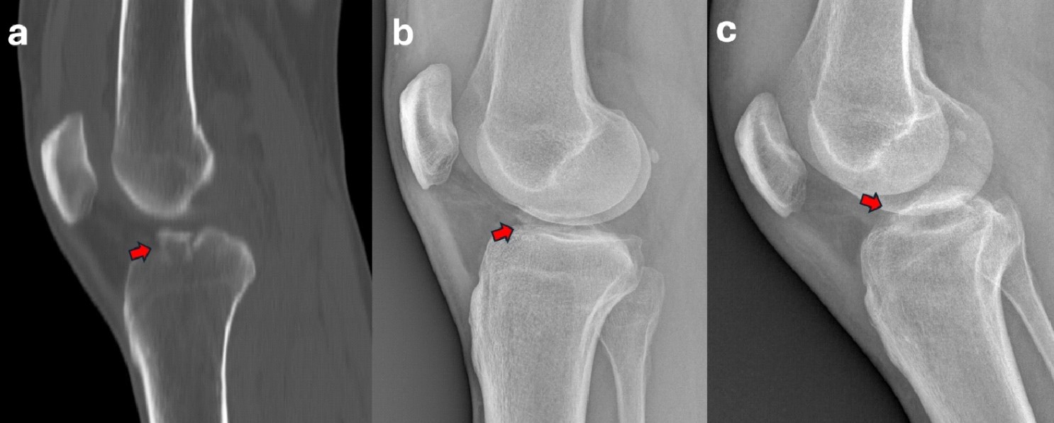 Figure 12. A 17-year-old male with a Meyers and McKeevers Type IV fracture (red arrow) in sagittal CT scan (a) and lateral radiographs (b). Radiograph at 6-week follow-up showing good reduction and healing of the fragment (red arrow) (c).